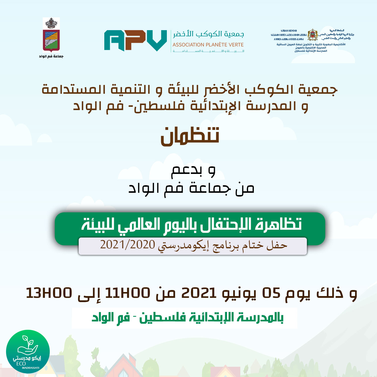بمناسبة اليوم العالمي للبيئة الذي يصادف 05 يونيو من كل سنة، و في إطار برنامج إيكومدرستي، تحتفل جمعية الكوكب الأخضر للبيئة و التنمية المستدامة و المدرسة الابتدائية فلسطين - فم الواد باليوم العالمي للبيئة.