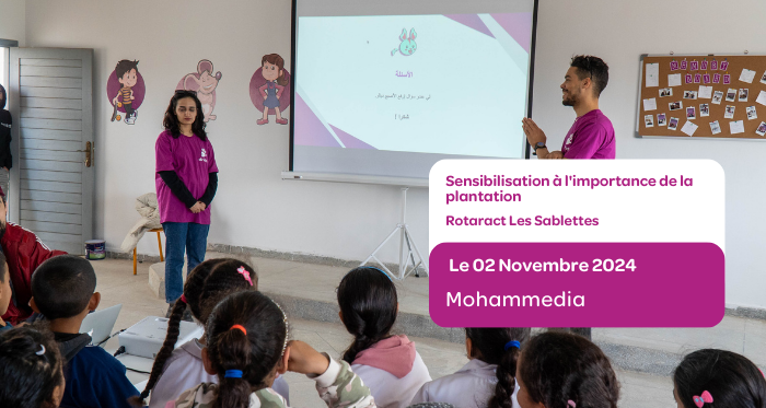 Le club Rotaract Les Sablettes organise une action de plantation d’arbres et de plantes dans une école à Chlalat, accompagnée d’un atelier de sensibilisation sur l’importance de cette initiative pour l’environnement. Cette activité vise à inculquer aux élèves des valeurs écologiques et à les encourager à protéger la nature dès le plus jeune âge.