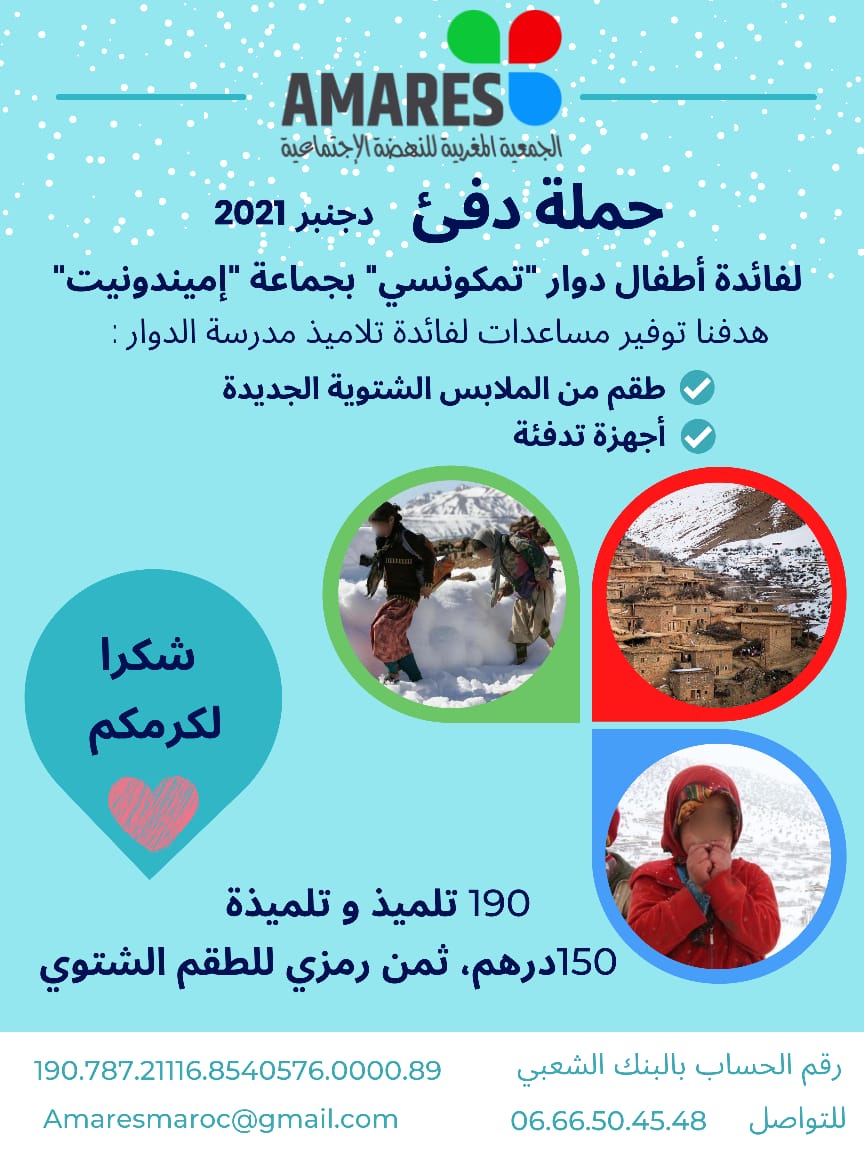 تنظم جمعية AMARES نسخة 2021 من قافلة التضامن "حملة الشتاء الساخن" لفائدة تلاميذ قرية إيمي ندونيت بإقليم شيشاوة ، حيث سيتم توزيع الملابس والأحذية والبطانيات على 190 طفلاً من القرية.