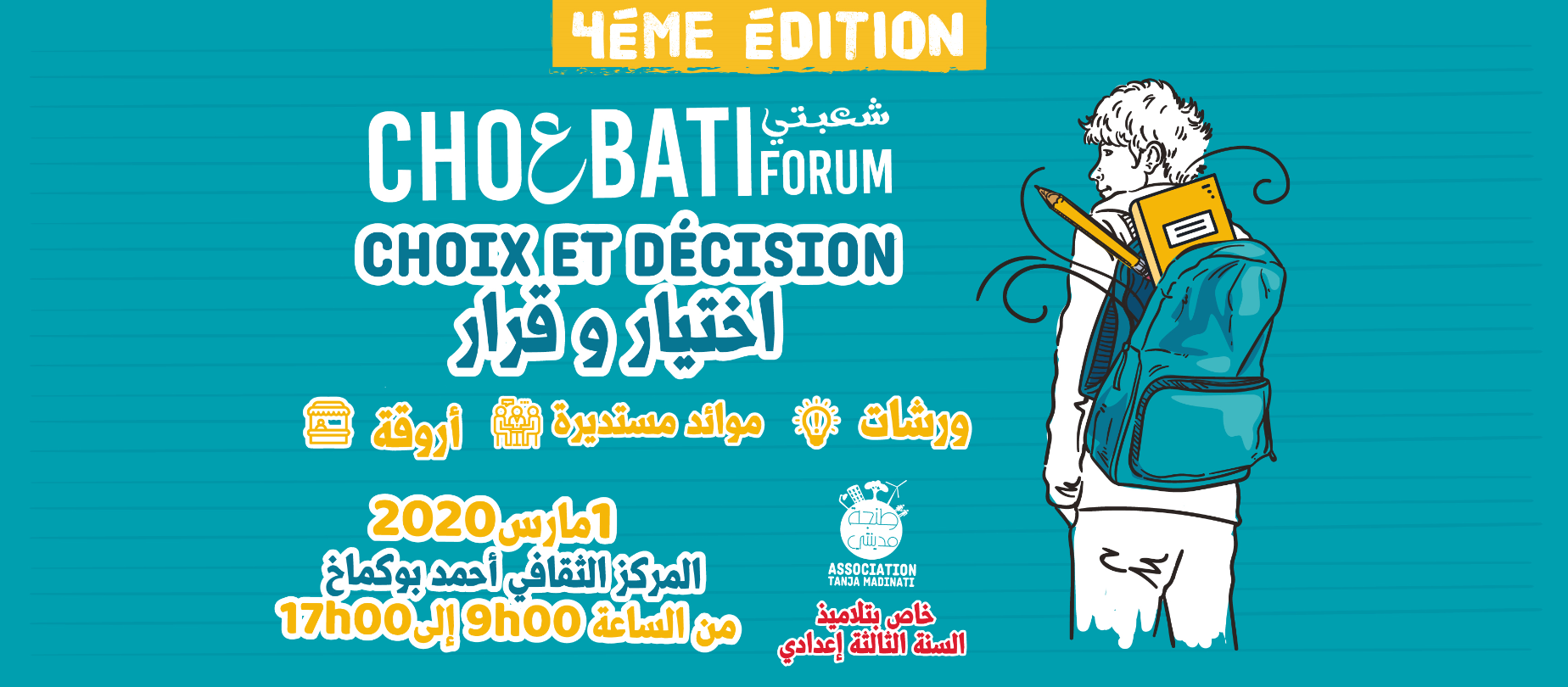 النسخة الرابعة لشعبتي فوروم، عرض لمختلف الشعب والتوجهات المتاحة ما بعد السنة الثالثة اعدادي بهدف مساعدة التلاميذ على اختيار مسارهم الدراسي، ورشات خاصة لاكتشاف ميولاتهم و رغباتهم ، بالإضافة إلى مرافقة حول طرق إختيار التوجه الملائم لشخصيتهم.