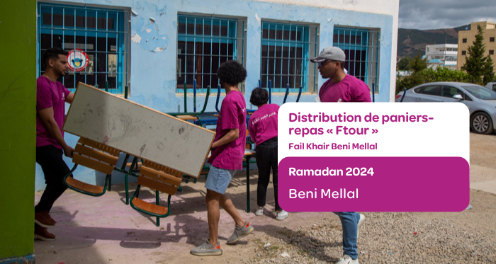 خلال شهر رمضان الكريم، تعمل جمعية فاعل خير بني ملال بجد واجتهاد لتقديم الدعم الأساسي لسكان مدينة بني ملال. حيث يتم يومياً توزيع سلال وجبات "الفطور" لفائدة سكان المدينة.
