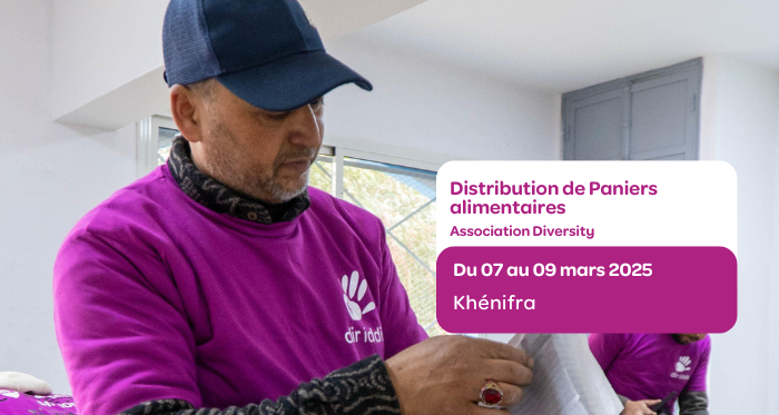 En ce mois sacré de Ramadan, l’association Diversity déploie avec détermination ses efforts pour apporter un soutien essentiel à la population de la ville de Khénifra. Du 7 au 9 mars, 350 paniers de Ramadan contenant des produits de première nécessité seront distribués aux familles de veuves, d’orphelins et aux familles démunies dans le village de Sidi Mubarak , situés dans la commune de Had Bouhoussoun - Province de Khénifra.
