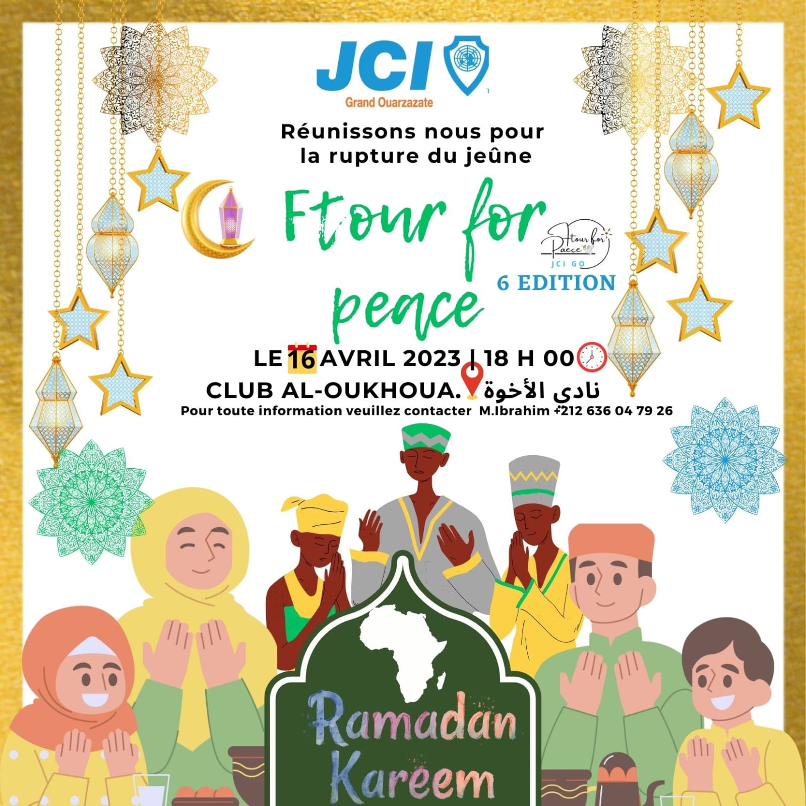 Le JCI Grand Ouarzazate organise la 6ème édition de "Ftour pour la paix" qui aura lieu le 16 avril 2023 et sera axée sur l'hommage à la communauté Sud africaine au Maroc. L'événement réunira des personnes de différentes nationalités et religions pour célébrer la diversité et promouvoir le dialogue interculturel. Cet événement est une occasion de partager les valeurs universelles d'amour et de solidarité, et un effort pour établir la paix grâce à la compréhension culturelle. Le JCI GO invite toutes les parties intéressées à rejoindre l'association pour célébrer la 6ème édition de "Ftour pour la paix" et à faire partie d'un échange culturel qui contribuera à une meilleure compréhension, un respect accru et une paix dans notre monde.