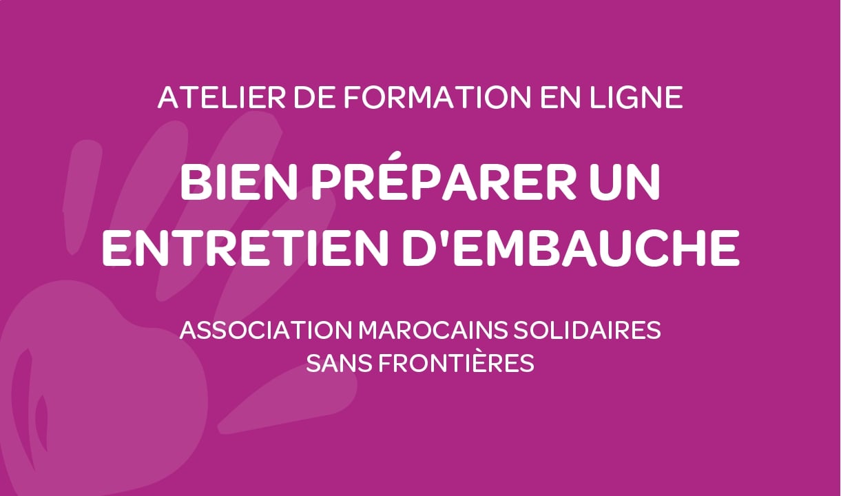 L’association Marocains Solidaires Sans Frontières organise des formations en ligne en soft skills durant l’été. Dans le même sens, l’association souhaite réaliser un atelier de péparation des entretiens, cet atelier aura lieu le 26 Août auprès des jeunes âgés de 18 ans et