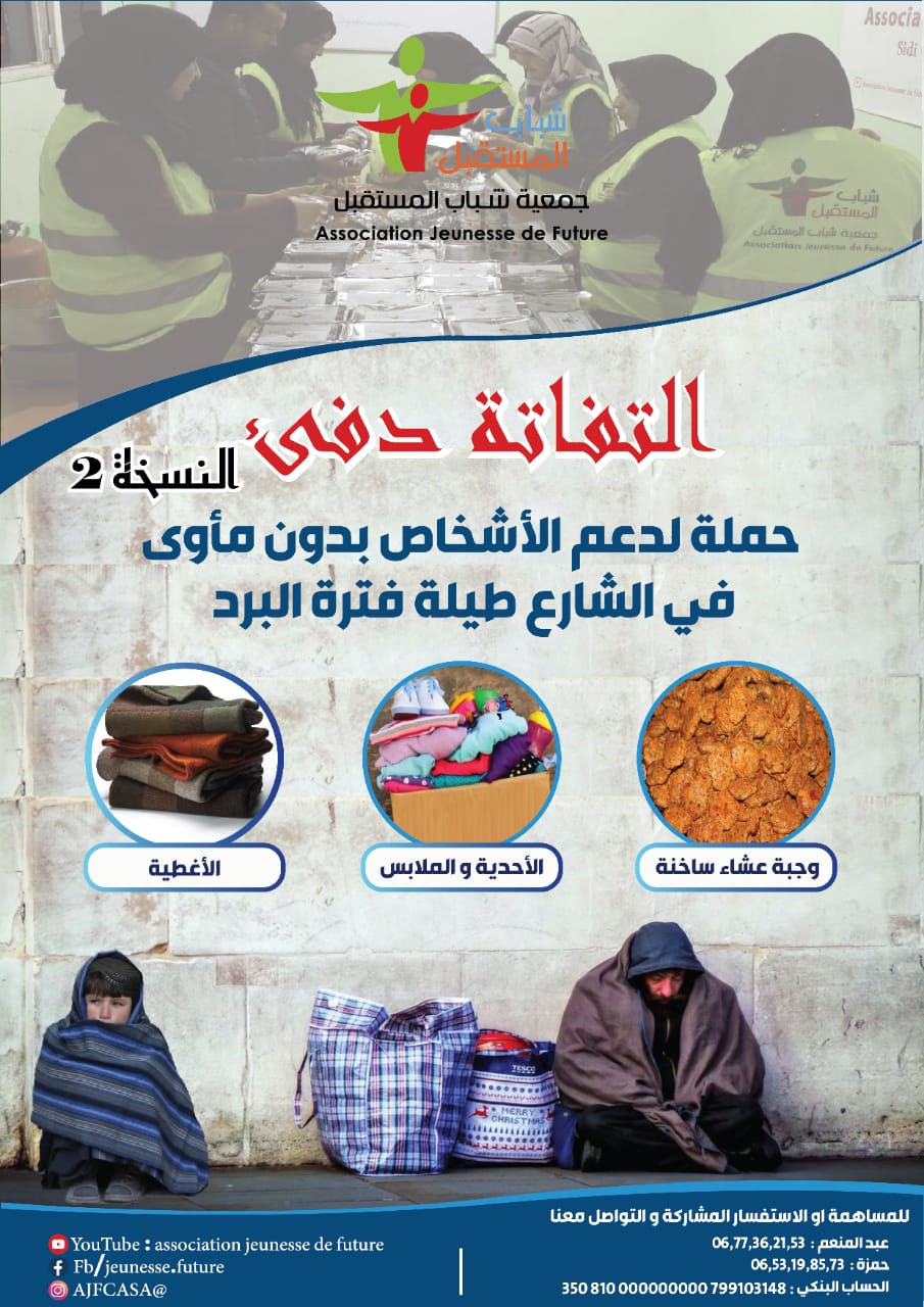 Association Jeunesse de future organise le samedi 20 Février des sorties aux quartiers de la ville de Casablanca pour venir en aide aux sans-abris en leurs distribuant des repas chauds, des couvertures et des vêtements contre le froid.