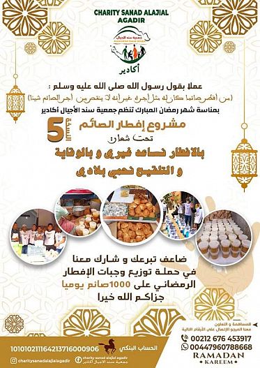 À L’occasion du mois sacré de Ramadan, Charity Sanad Al Ajial distribue dans la ville d’Agadir 1000 panier-repas « Ftour » chaque jour au profit des personnes les plus démunies.